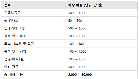 소품샵 창업 비용은 매장의 크기, 위치, 제품 종류에 따라 달라지지만, 일반적으로 2,000만 원~1억 원 수준의 자금이 필요합니다.