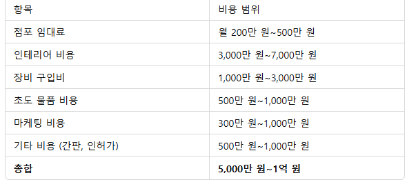 💡 Tip: 상권에 따라 임대료 차이가 크므로 유동인구와 경쟁 점포 분석이 필수입니다.