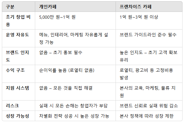✅ 1. 개인카페 vs 프랜차이즈 카페 – 차이점 한눈에 비교