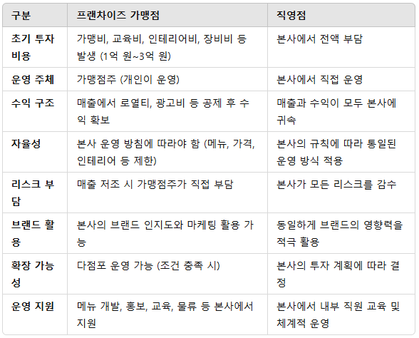 ✅ 2. 프랜차이즈 가맹점 vs 직영점 차이점 비교