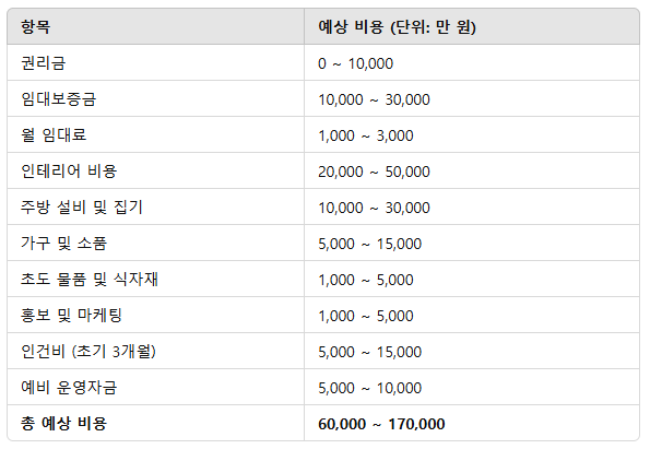 창업 비용은 업종과 상권, 매장 컨셉에 따라 다르지만, 일반적으로 다음과 같은 항목으로 구성됩니다.